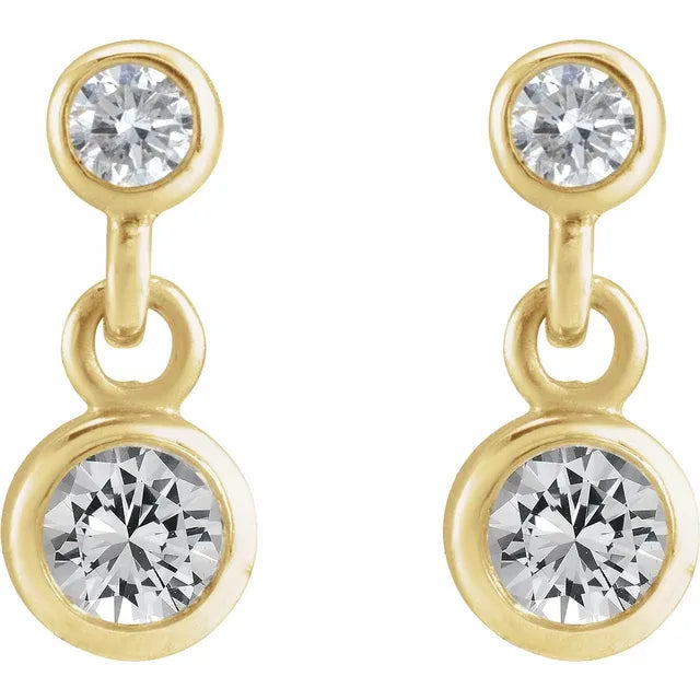 Øreringene måler ca. 8,5 × 3 mm og har en elegant, slank profil med en total længde på ca. 11,8 mm og en bredde på 4,57 mm. De er udført i massivt 14 karat gult guld med en poleret finish, hvilket giver en varm glans, der fremhæver stenenes rene, lyse udtryk.